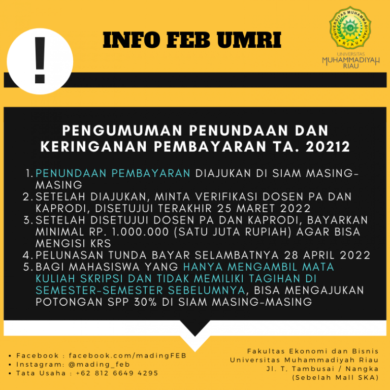 Sesuai dengan Surat Keputusan Rektor Nomor : 336/KEP/II.a.AU/C/2022 tentang Penetapan Biaya Wisuda XXII Dan Uang Wakaf Tunai Untuk Pembangunan Gedung Tajdid Center Universitas Muhammadiyah Riau Tahun Akademik 2021/2022 dan surat pengumuman Universitas tentang Persyaratan dan Ketentuan Wisuda Universitas Muhammadiyah Riau ke-XXII T.A 2021/2022, maka kami sampaikan :