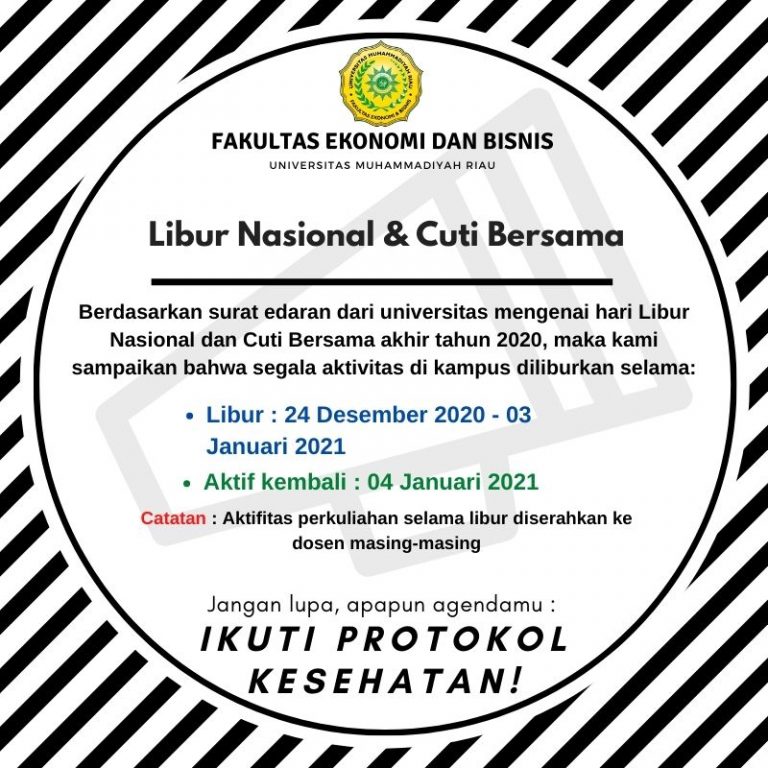 Berkenaan dengan hari libur Nasional dan cuti Bersama tahun 2020, untuk itu diberitahukan kepada seluruh Fakultas Ekonomi dan Bisnis Universitas Muhammadiyah Riau perihal libur cuti
