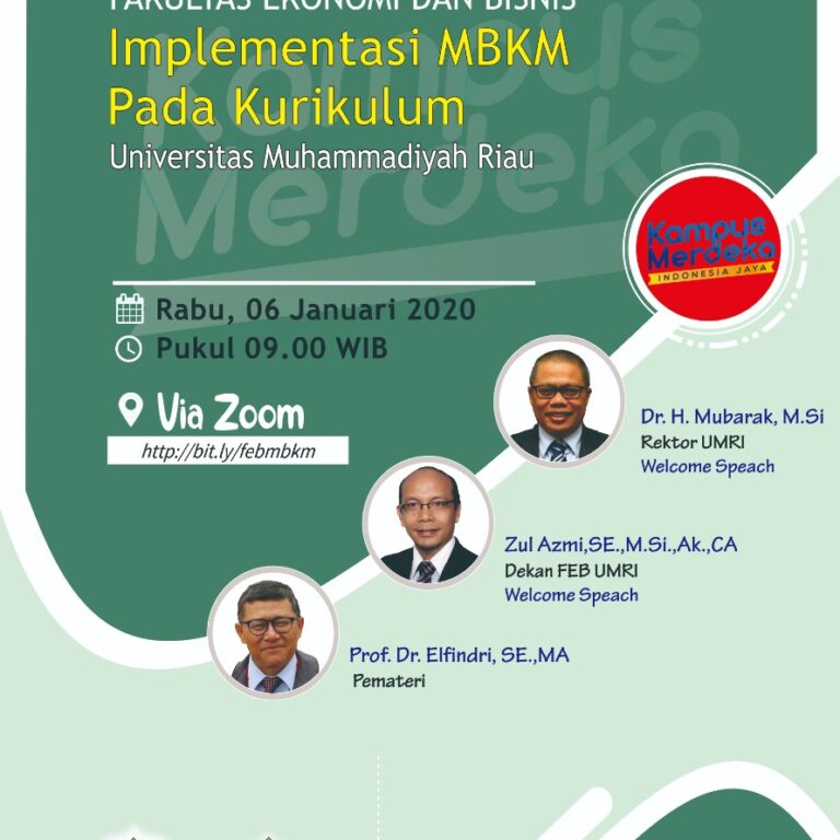Webinar: Implementasi MBKM Di Fakultas Ekonomi dan Bisnis Universitas Muhammadiyah Riau Hari/Tanggal : Rabu, 06 Januari 2021 Waktu : 09:00 – Selesai Link Zoom : http://bit.ly/MBKMFEBUMRI