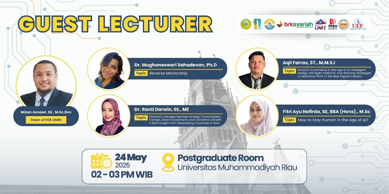 PEKANBARU, 24 MEI 2025 – Fakultas Ekonomi dan Bisnis Universitas Muhammadiyah Riau (FEB UMRI) menyelenggarakan guest lecture internasional yang menghadirkan empat pakar dari berbagai bidang keilmuan. Acara yang dibuka secara resmi oleh Dekan FEB UMRI, Mizan Aznawi, S.E., M.Ec.Dev, ini berlangsung di Ruang Kuliah Pascasarjana UMRI, Gedung Rektorat Lantai 6, dan dihadiri oleh mahasiswa dari Management and Science University (MSU) Malaysia serta Universiti Malaysia Terengganu.