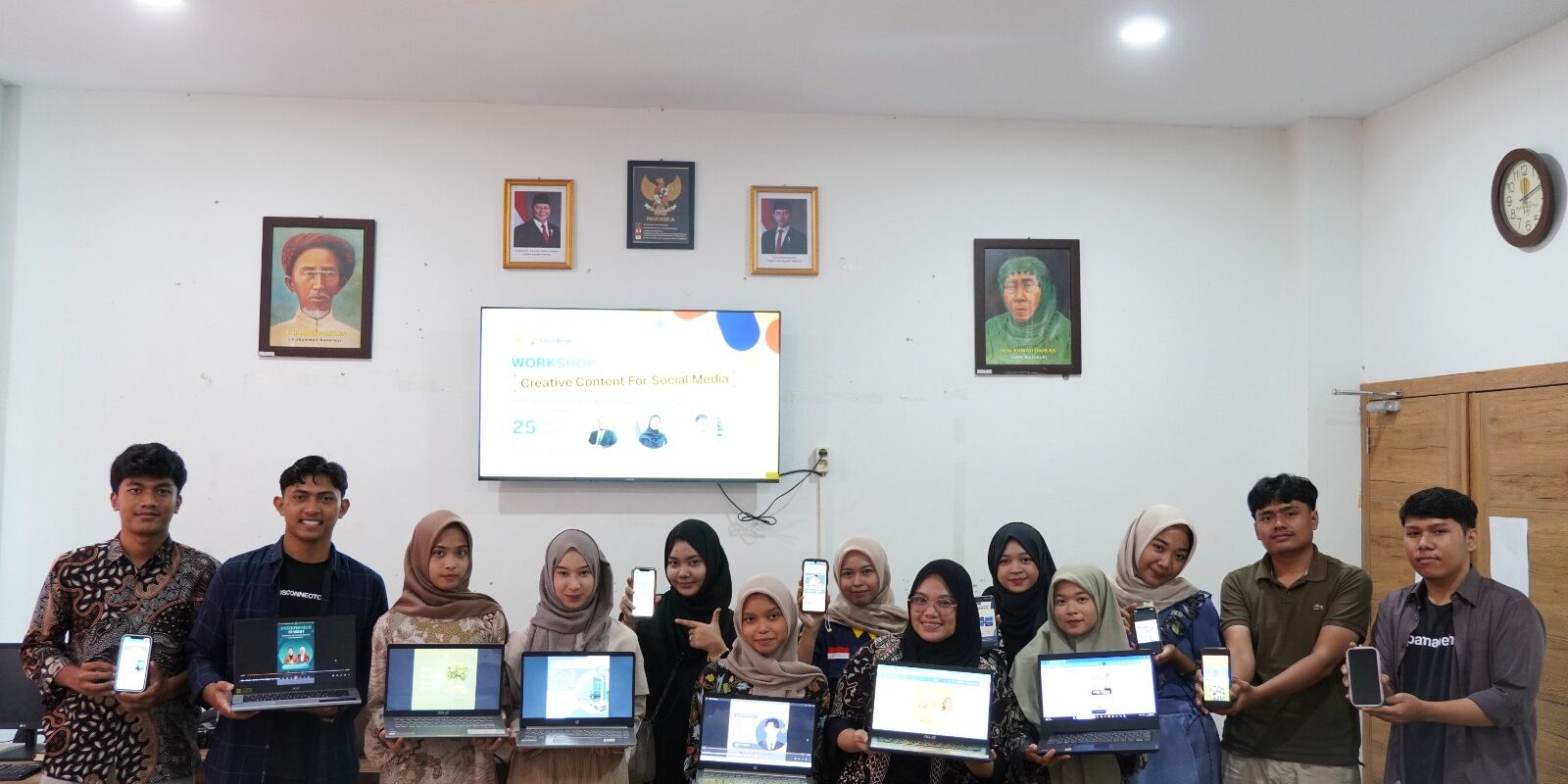Setelah sesi materi dan praktik selesai, kegiatan diakhiri dengan sesi foto bersama sebagai dokumentasi momen berharga dalam workshop ini. Acara ini diharapkan dapat memberikan manfaat besar bagi para peserta dalam mengembangkan kreativitas serta keterampilan mereka di dunia digital. Workshop ini juga menjadi langkah awal dalam membangun komunitas kreator konten yang mampu bersaing di era digital, serta mendukung inovasi dalam pemasaran dan komunikasi di media sosial.